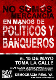 Durante estos días se han llevado a cabo manifestaciones por todo el ámbito nacional reclamando una nueva política de Estado en la que no estemos en las manos de políticos y banqueros y a la vez una serie de medidas para llevarse a cabo ya que todos queremos una sociedad justa y no que nos engañe por nuestros derechos y necesidades, ya que parece que no vivimos libres sino que estamos manejados por toda esa “basura” de personas que solo buscan su beneficio propio a través de nuestros derechos y necesidades y a los demás que nos den y nos busquemos la vida para poder salir adelante.